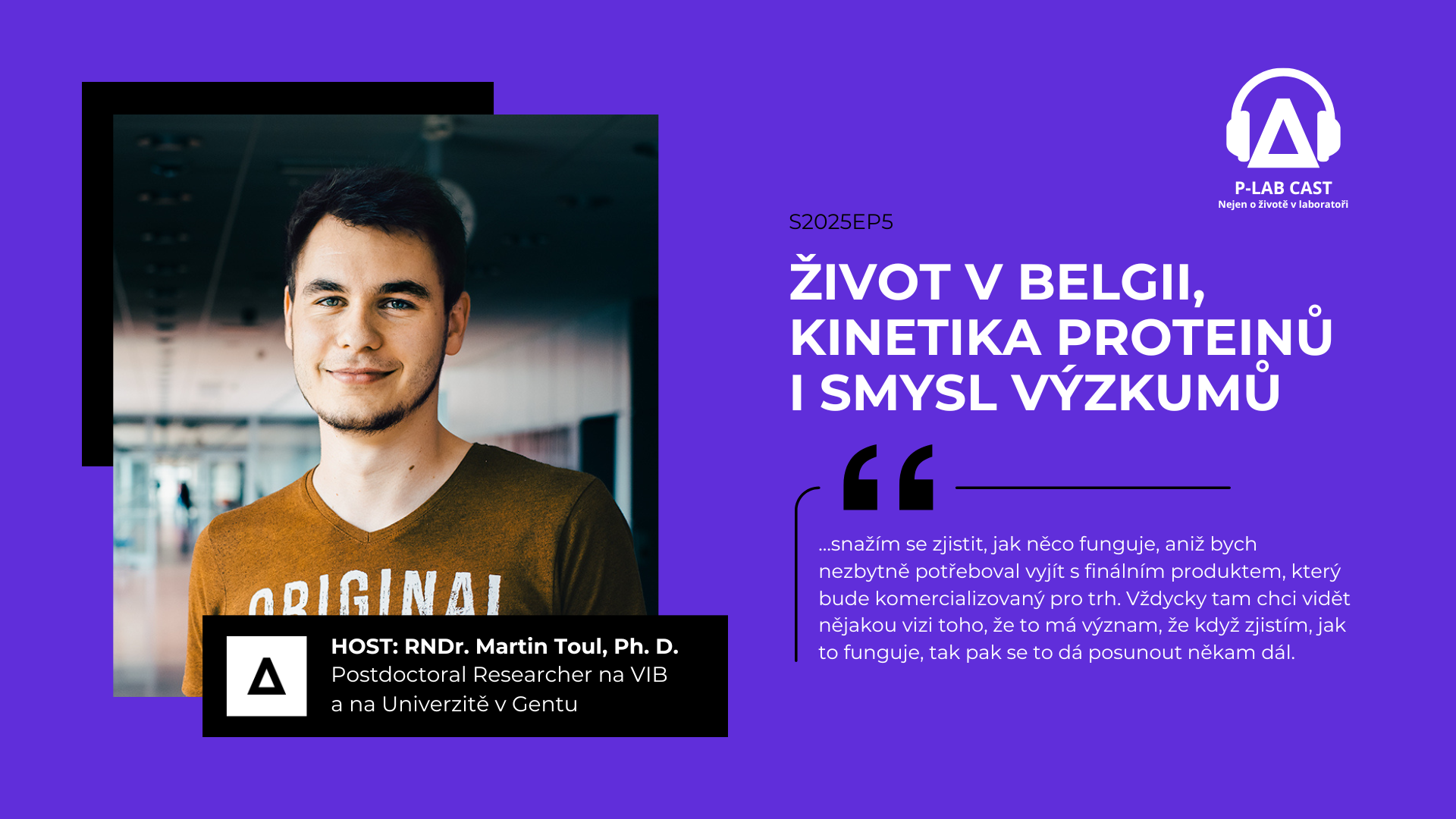 V 5. epizodě P-LAB CAST, podcastu nejen o životě v laboratoři byl hostem RNDr. Martin Toul, Ph.D., který vystudoval bakalářský a navazující magisterský studijní program Biochemie na Přírodovědecké fakultě Masarykovy univerzity. Dále pak na stejné fakultě pokračoval doktorským studiem v programu Molekulární a buněčná biologie a genetika. Nyní už 2 roky působí v Belgii na Univerzitě v Gentu a v biotechnologickém institutu VIB. V podcastu jsme probírali výzkum, grant a jeho zisk, život v Belgii i budoucnost. Jak se Martin Toul dívá na výzkum, kam se chce posouvat a co je jeho cílem?